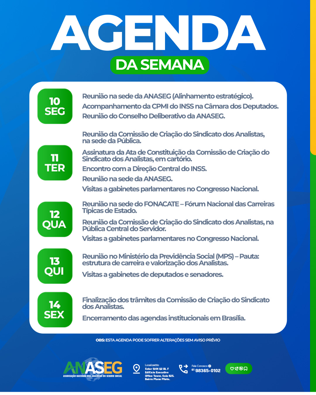 A programação inclui reuniões com órgãos do Governo Federal, entidades representativas e parlamentares, tendo como principal destaque o avanço no processo de criação do Sindicato dos Analistas do Seguro Social — um marco histórico para a categoria.